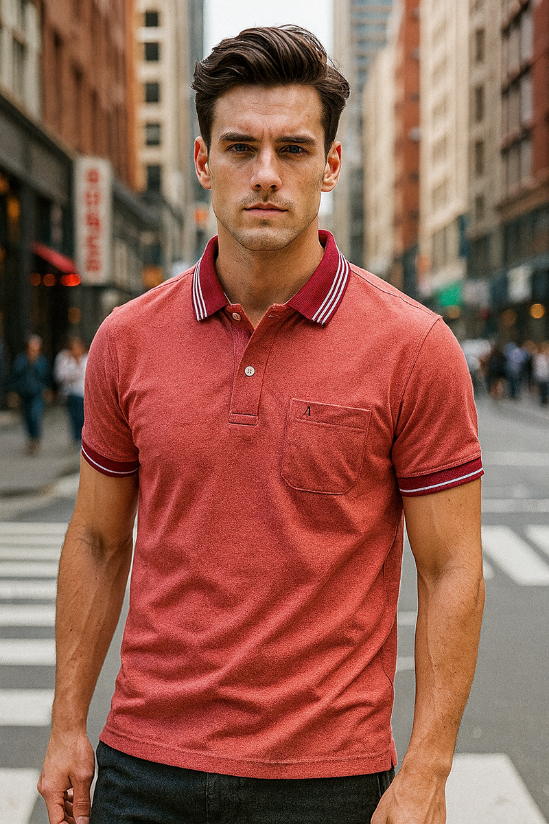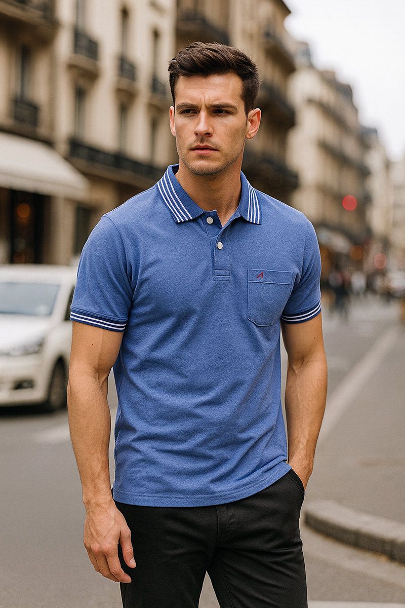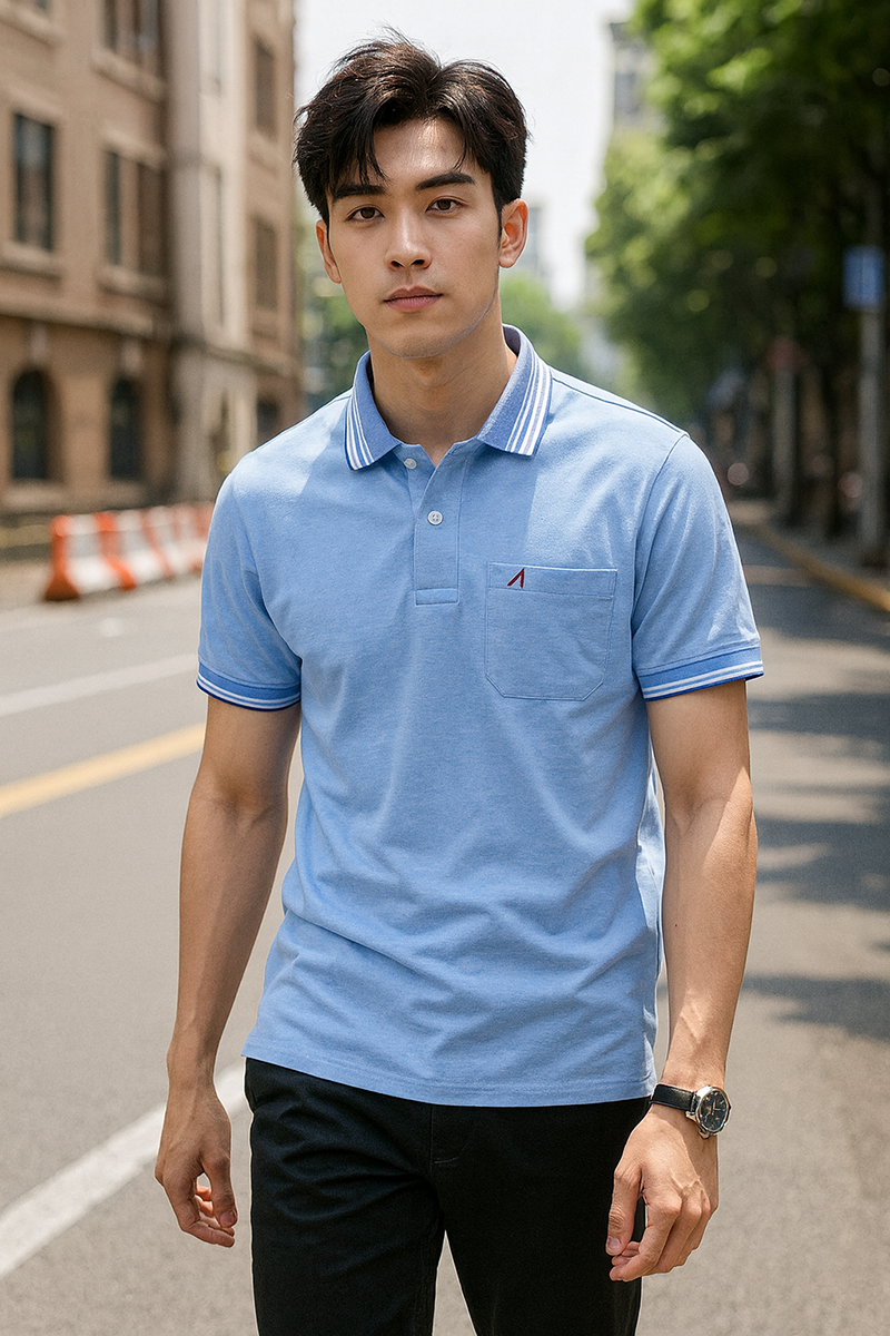 👉 Một item basic nhưng không hề đơn giản – thiết kế cổ bẻ lịch lãm, túi ngực tiện dụng, điểm nhấn logo chữ A thêu tinh tế, mang lại vẻ ngoài gọn gàng – trẻ trung – nam tính.