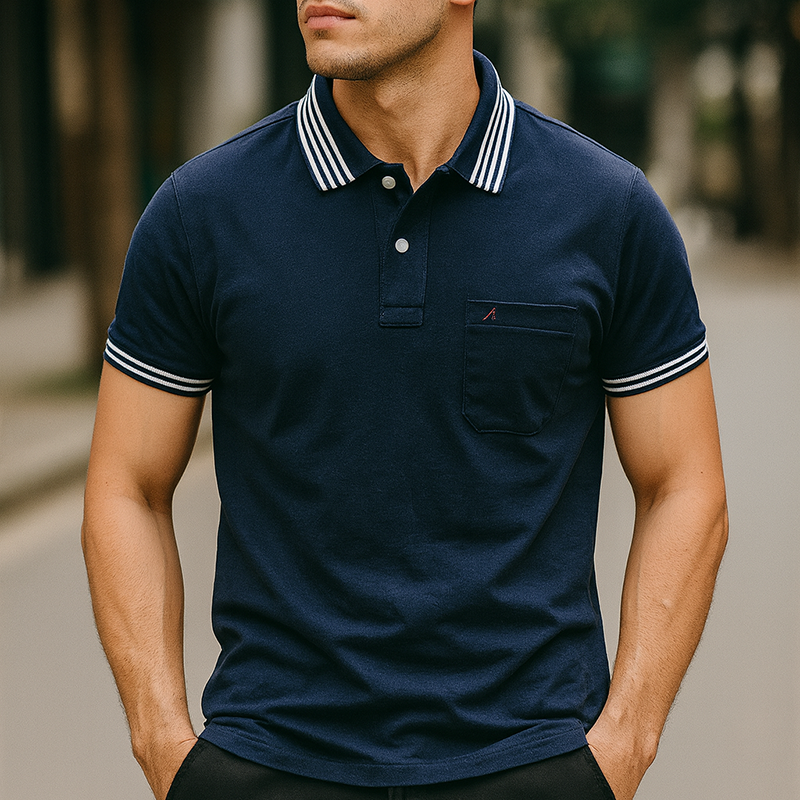 ✔ Thiết kế: Cổ bẻ phối sọc tinh tế, tay bo nhẹ, có túi ngực tiện lợi, logo A thêu sắc nét.