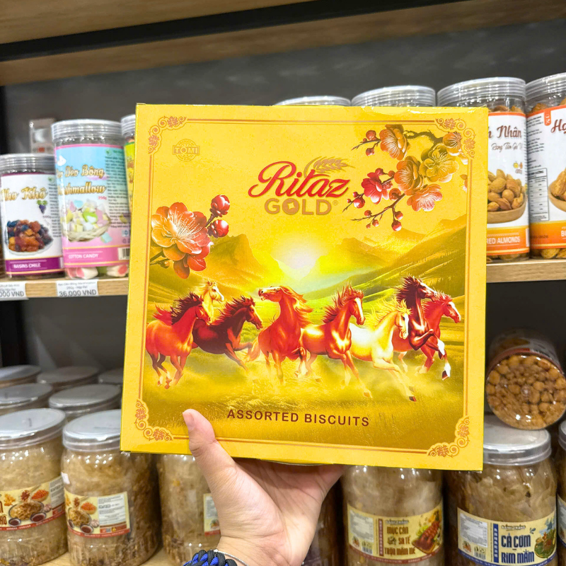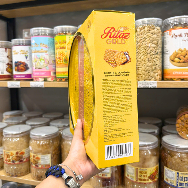 Bỏ sỉ bánh Quy RITAZ GOLD Thập Cẩm Hộp Thiếc Hoa Văn Vàng 315g