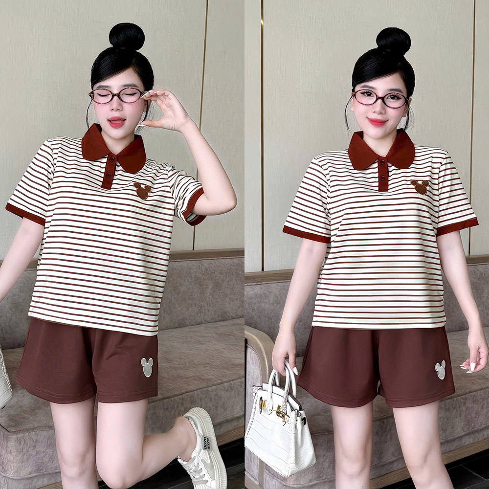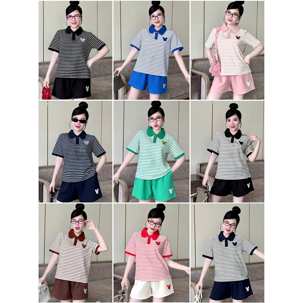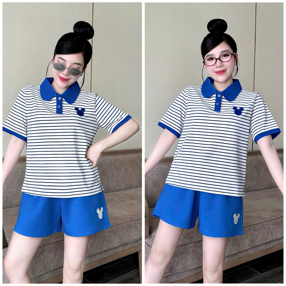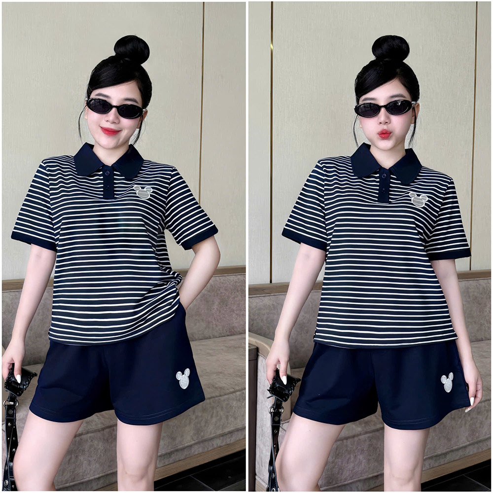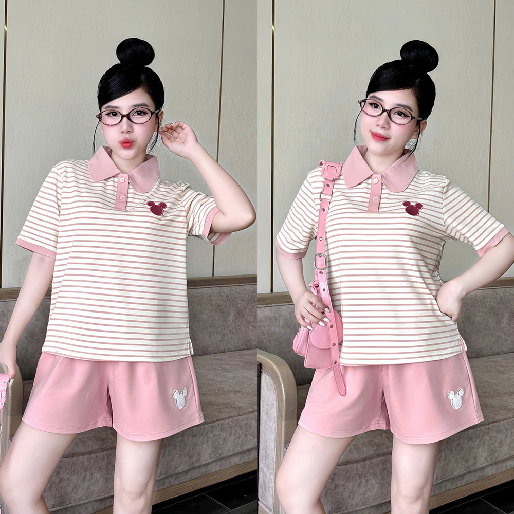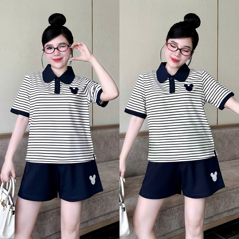 Đồ Bộ Nữ Áo Cổ Trụ Tay Ngắn Quần Đùi Họa Tiết Sọc Thêu Logo Mickey Mặc Mịn Mát Thoải Mái Size 45-62kg