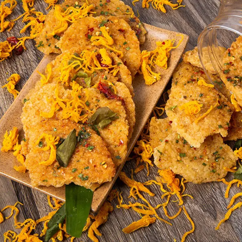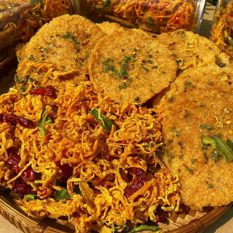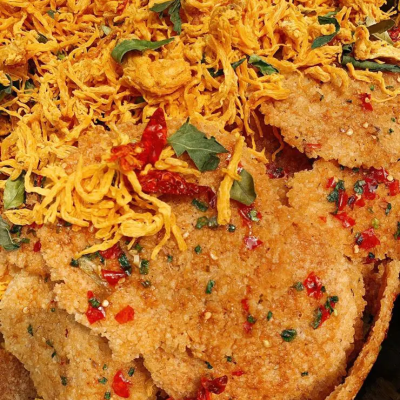 THÀNH PHẦN: Cơm cháy, khô gà, lá chanh, đường ớt,…