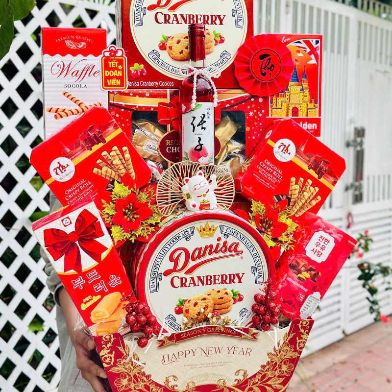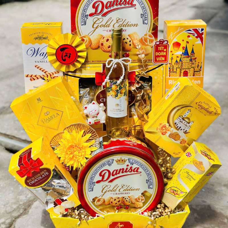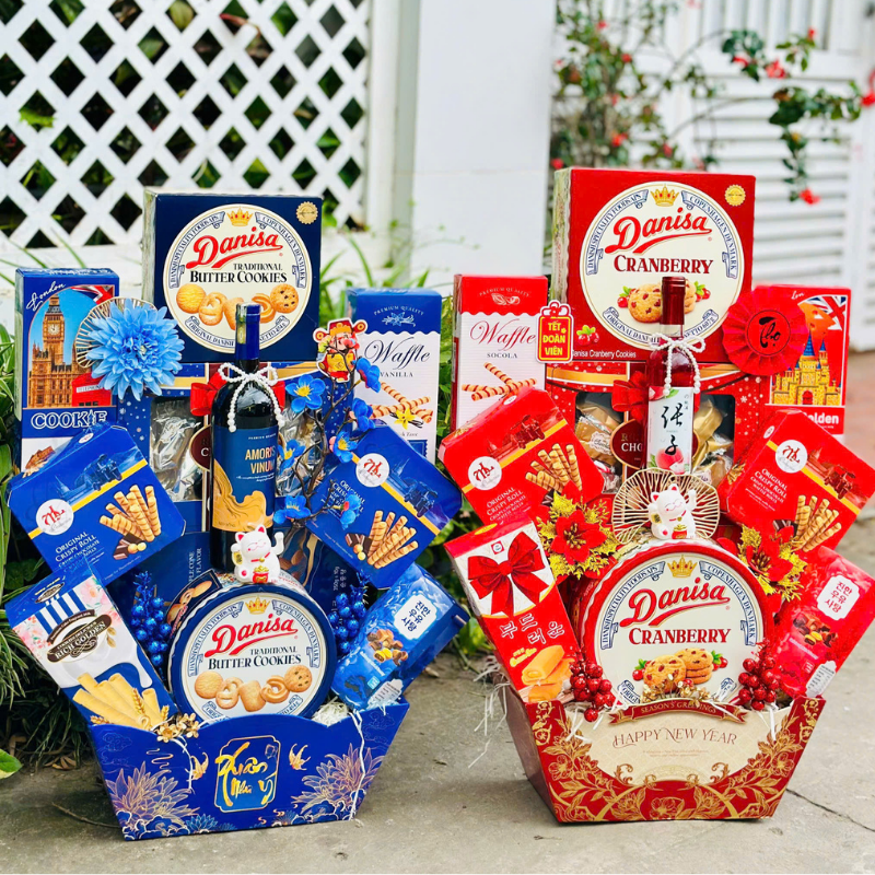 Mỗi giỏ đều được phối trang trí tỉ mỉ, lên form chắc chắn, tone màu đồng bộ, điểm nhấn sang trọng – mang đúng tinh thần chúc an khang – thịnh vượng – sum vầy của ngày Tết Việt.