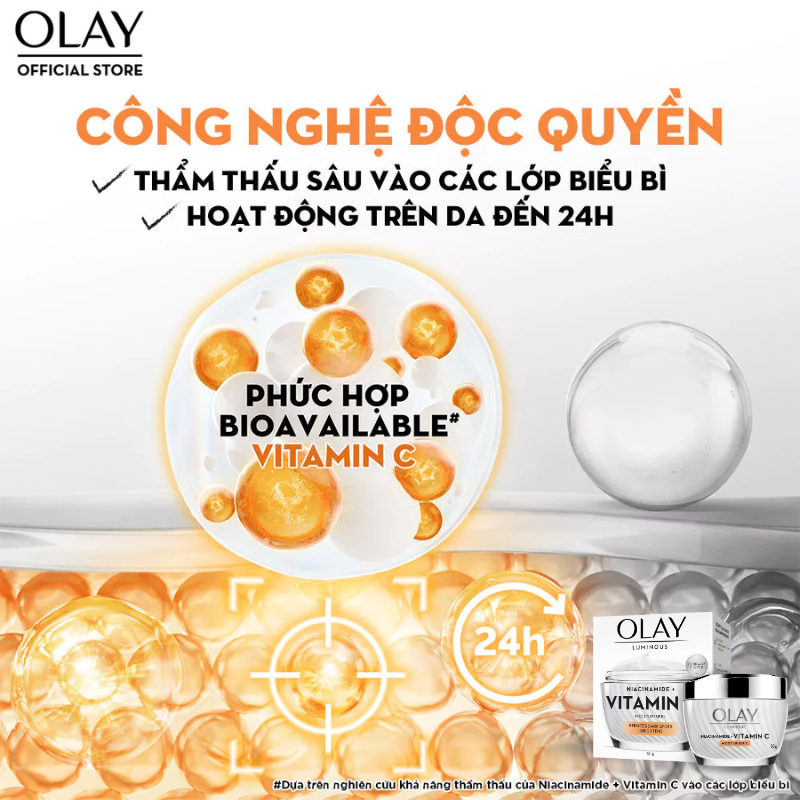 OLAY Luminous Niacinamide + Vitamin C ứng dụng phức hợp Bioavailable Vitamin C kết hợp Niacinamide ổn định.