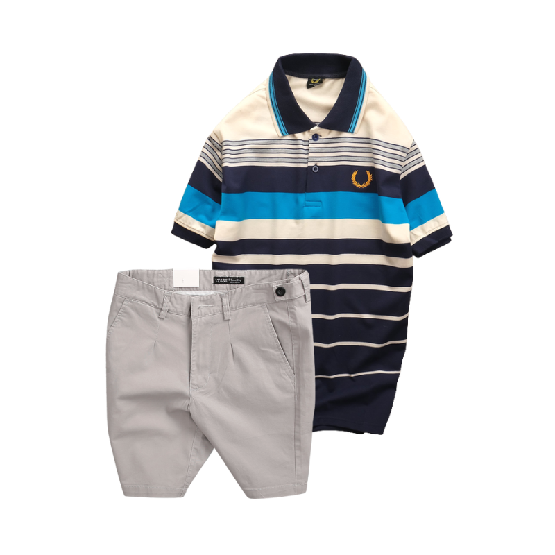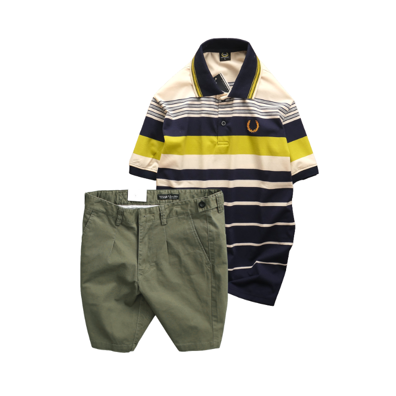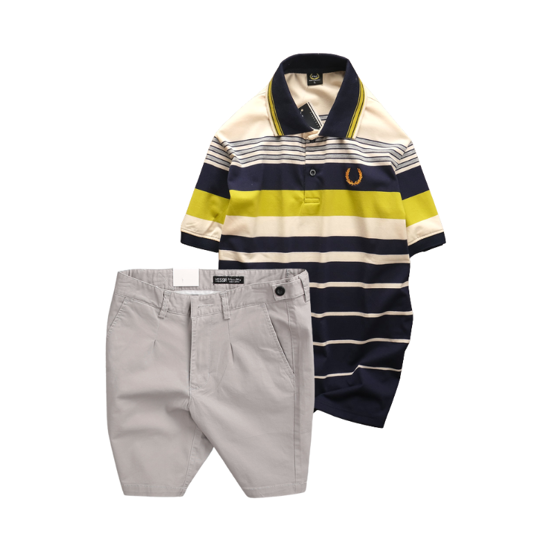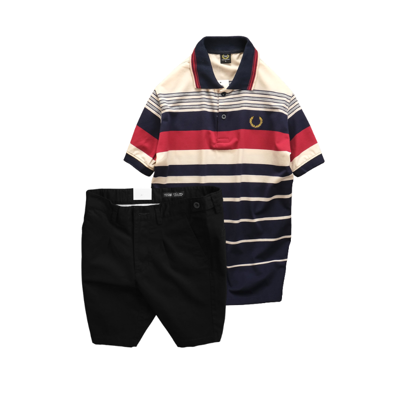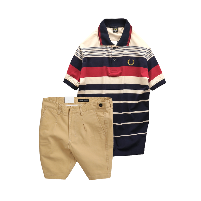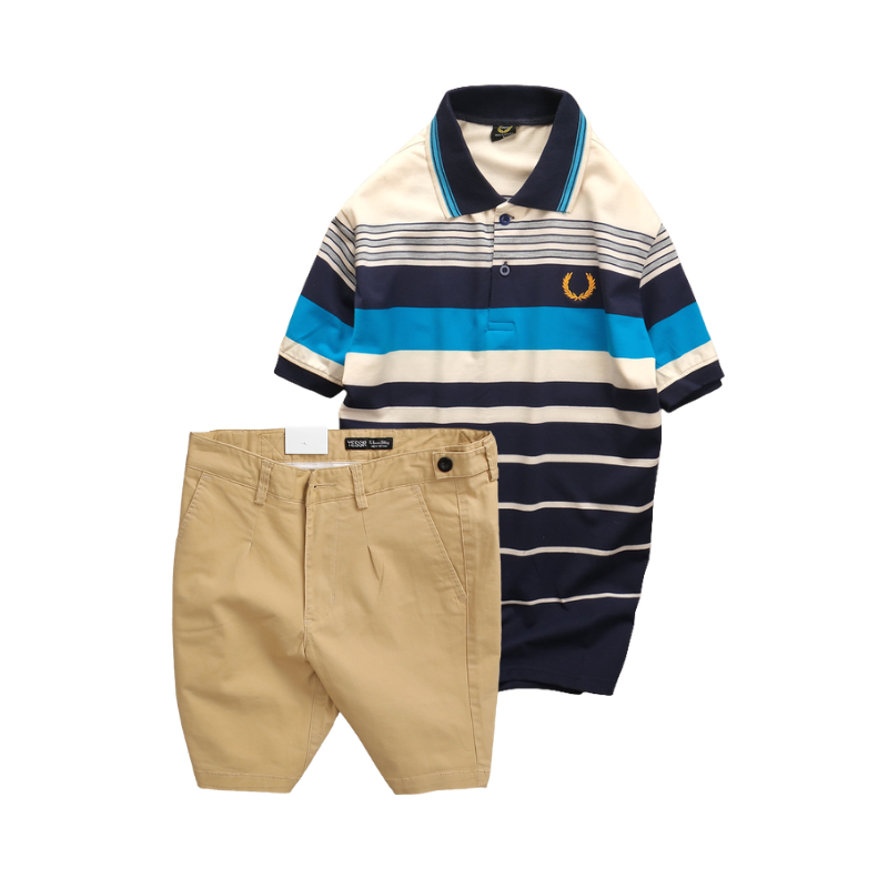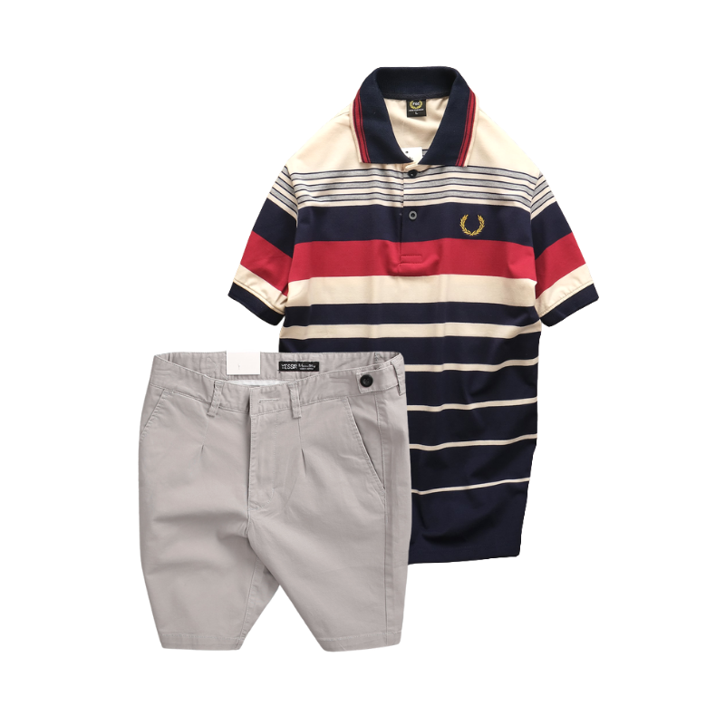 Set Bộ Nam – Áo Thun Nam Polo Cổ Bẻ Phối Sọc Vải Cotton Thêu Logo Hoàng Gia Và Quần Short Kaki Co Giãn Phối Nút Cao Cấp (Có Size 36)