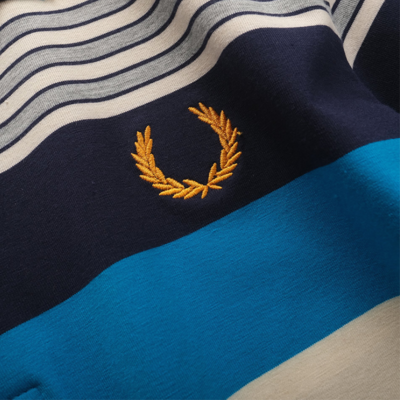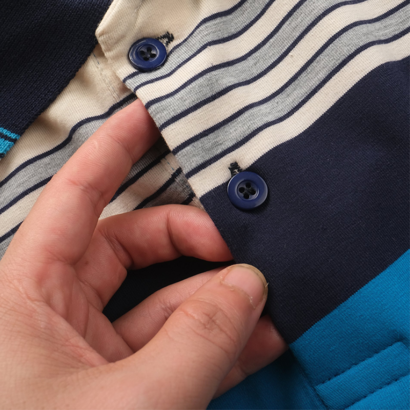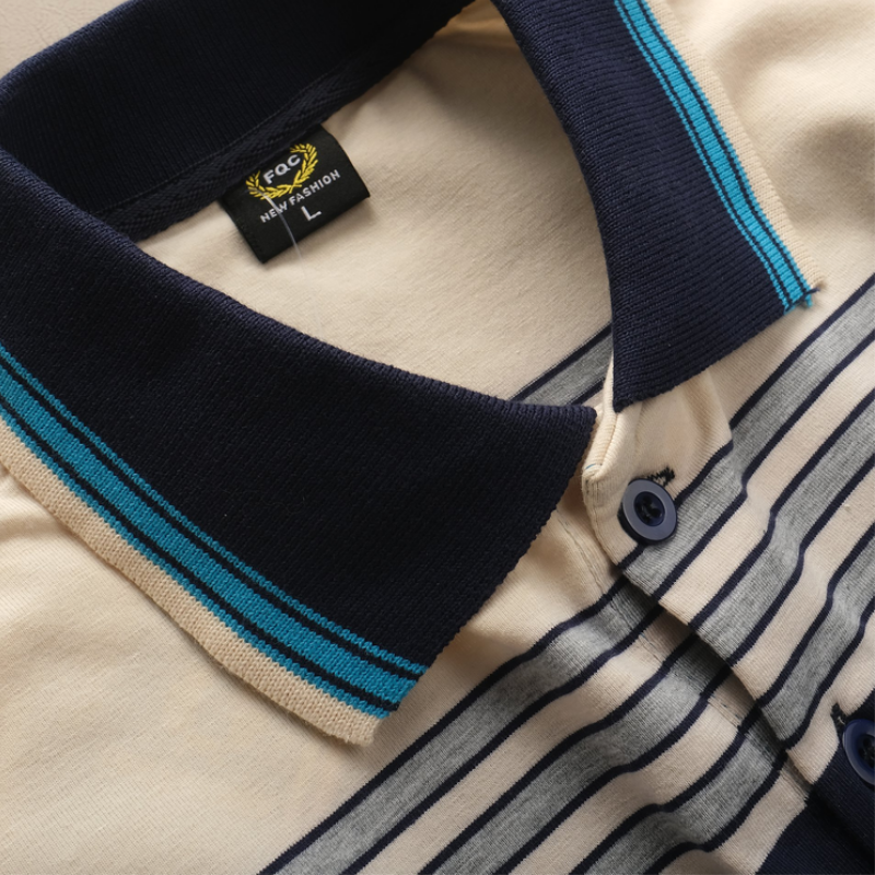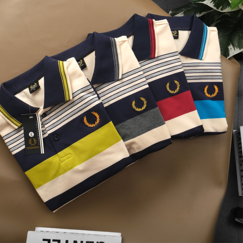 - Thiết kế áo thun polo cổ bẻ phối sọc ngang thêu logo hoàng gia trước ngực bền đẹp