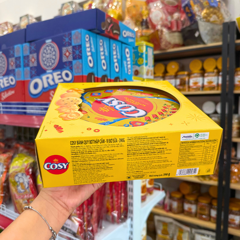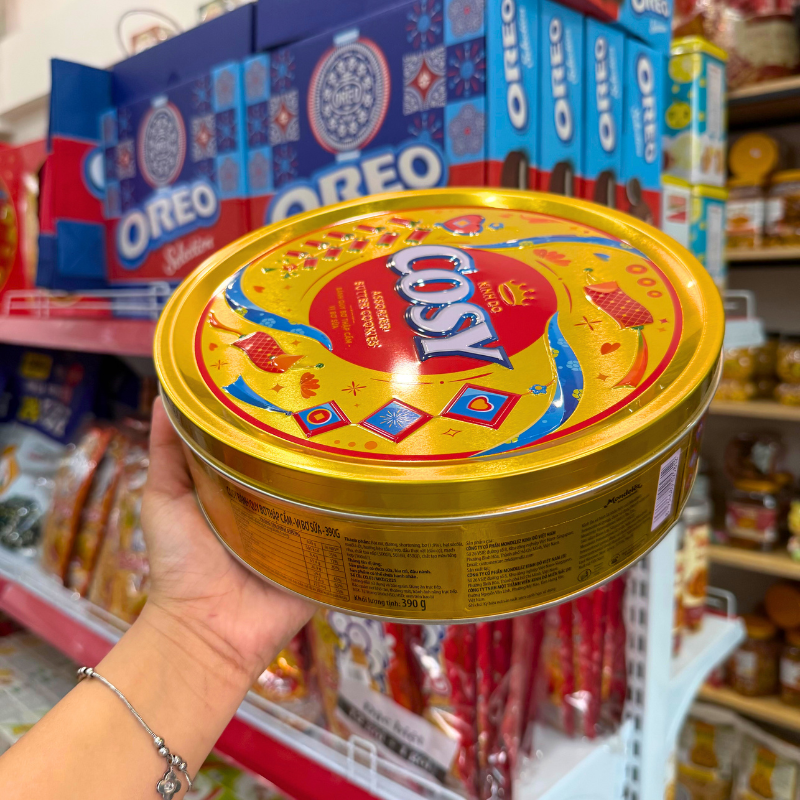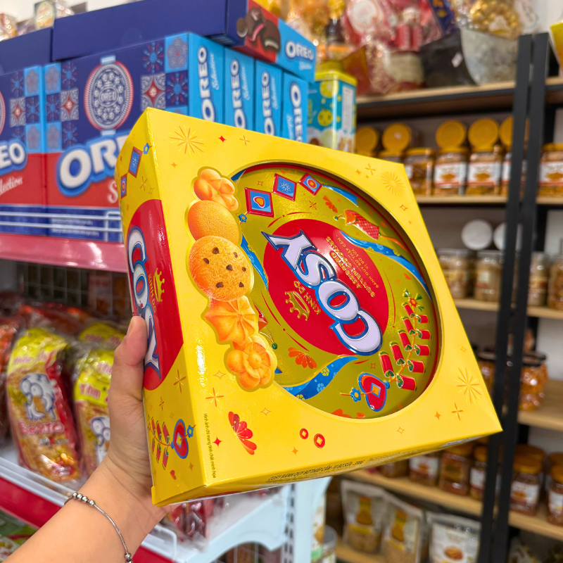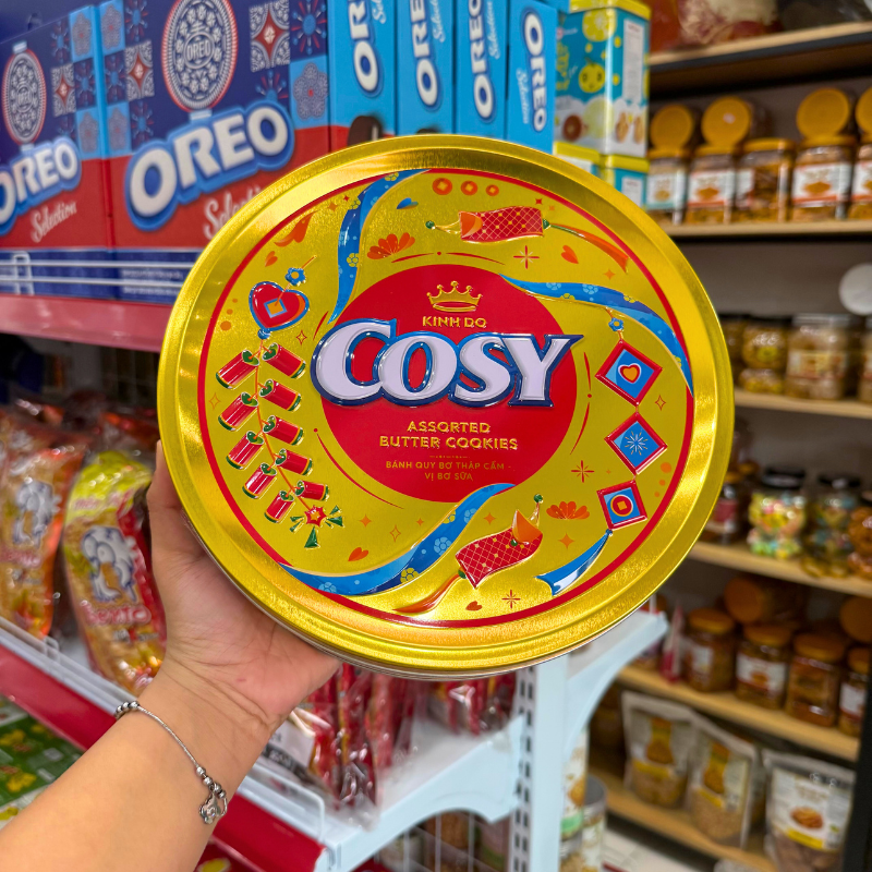 Shop sỉ bánh Cosy Quy Bơ Thập Cẩm Vị Bơ Sữa – Bánh Kinh Đô Cosy Bơ Sữa Hộp Thiếc Tròn Vàng 390Gr – Kèm Túi