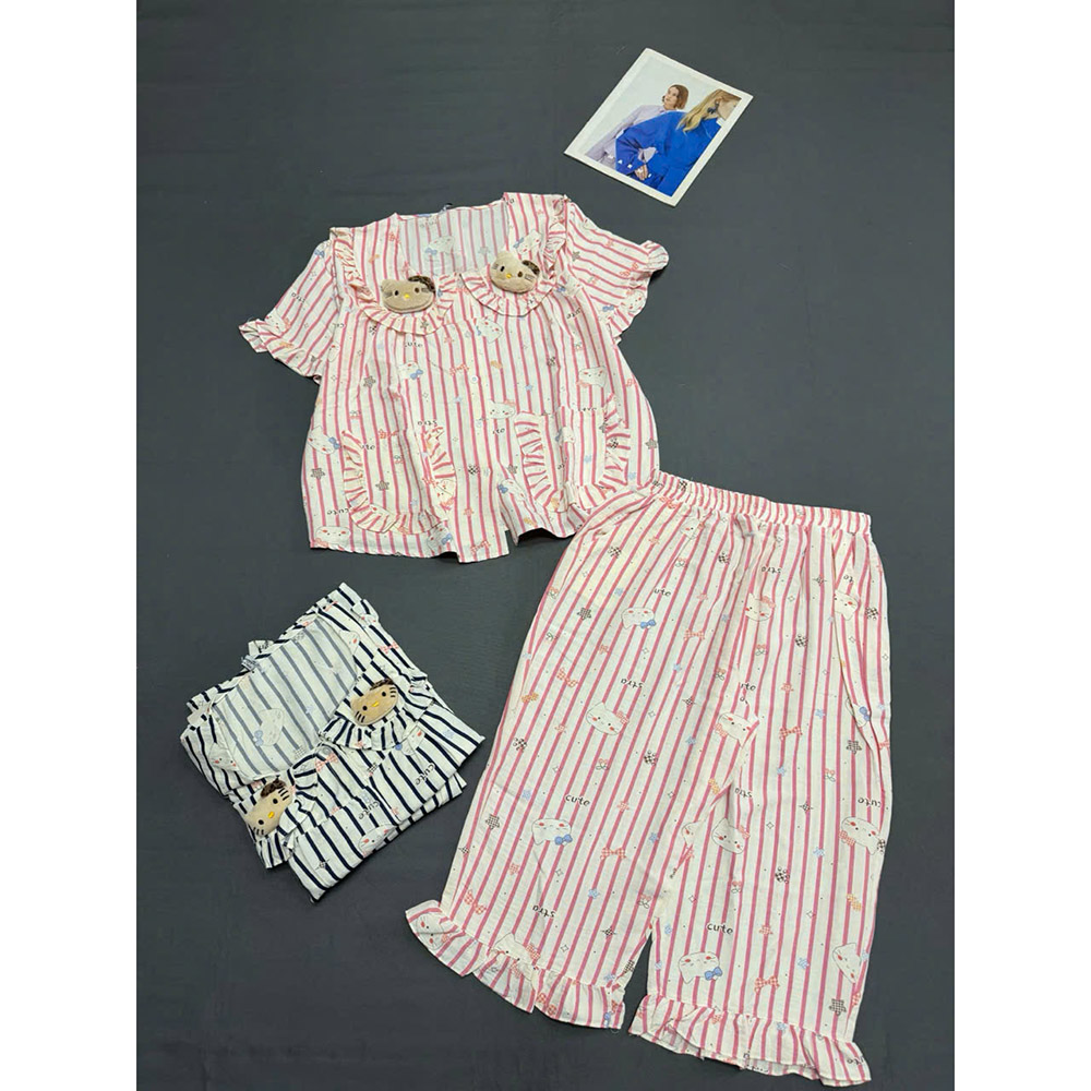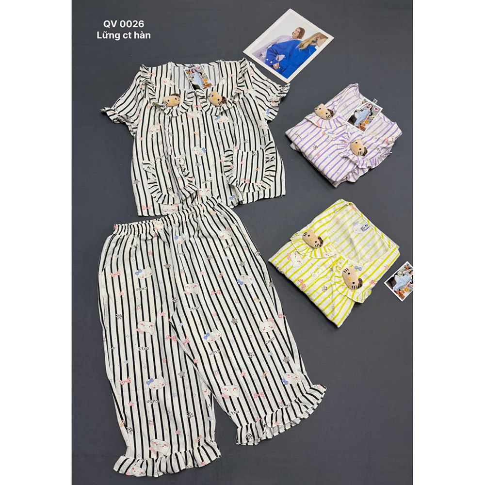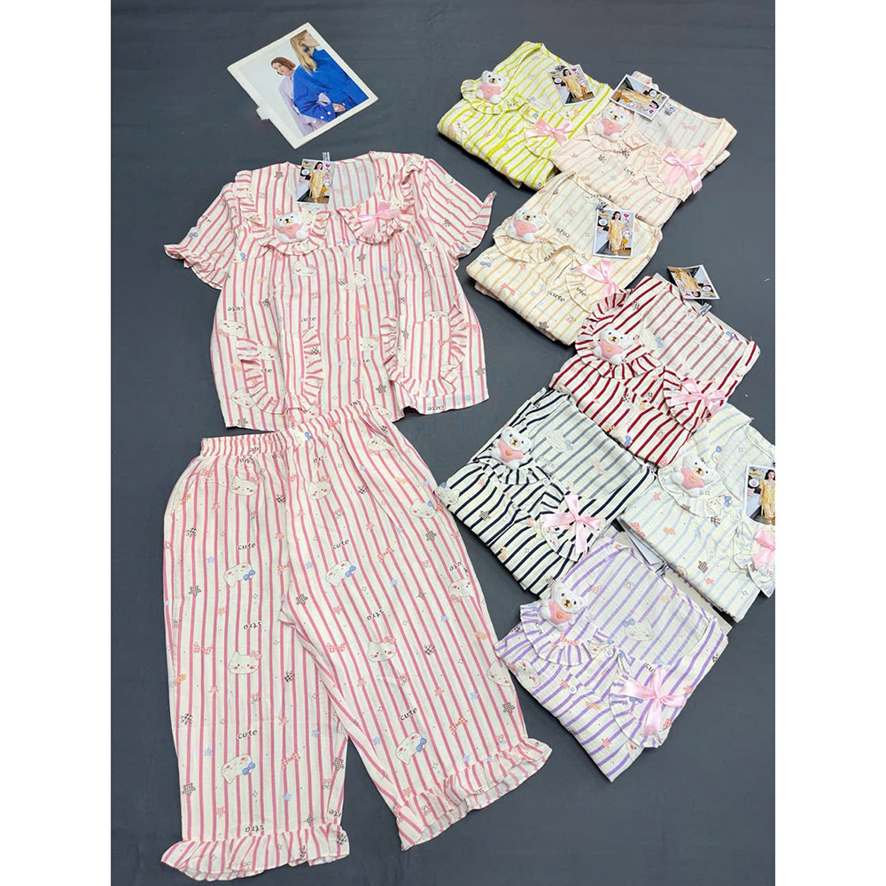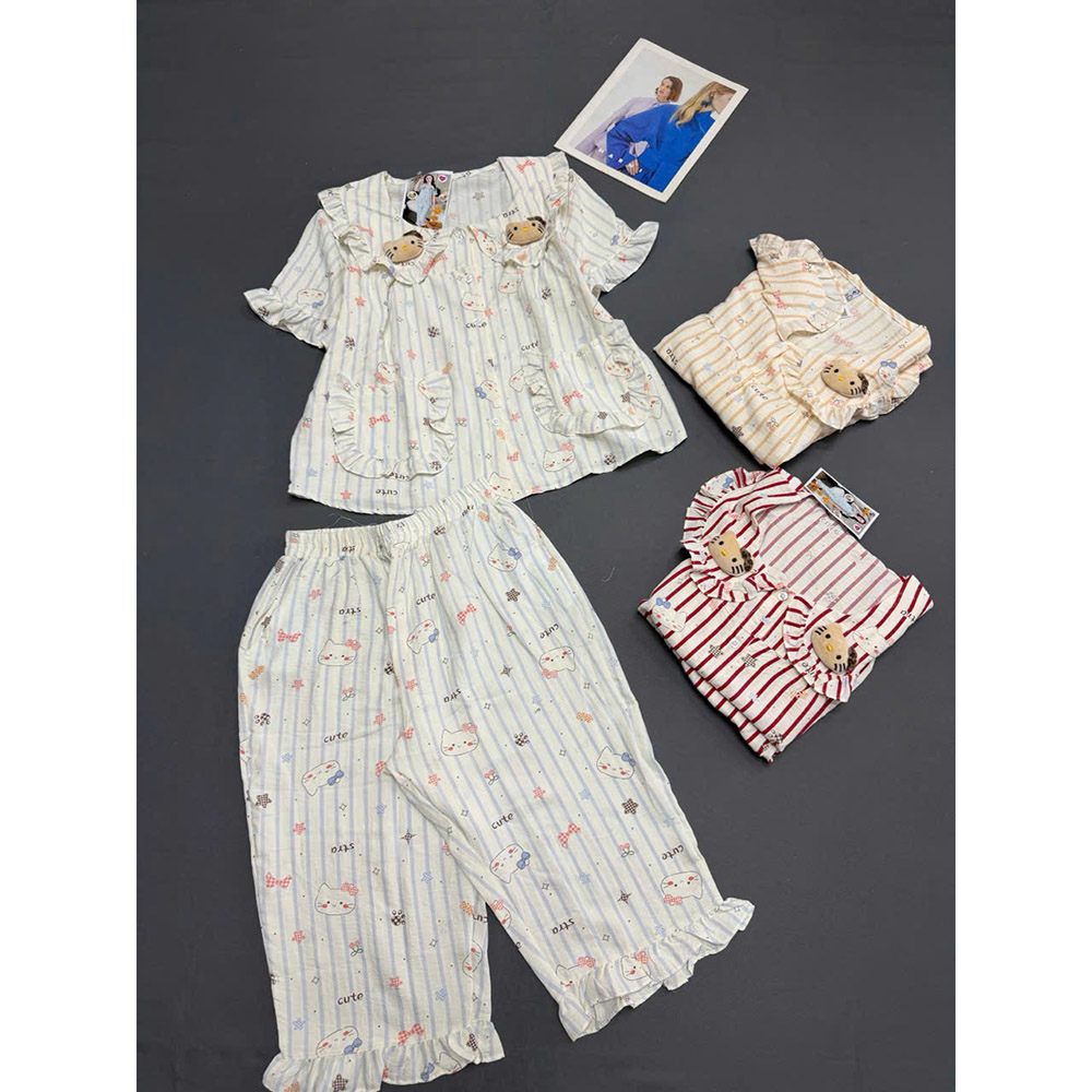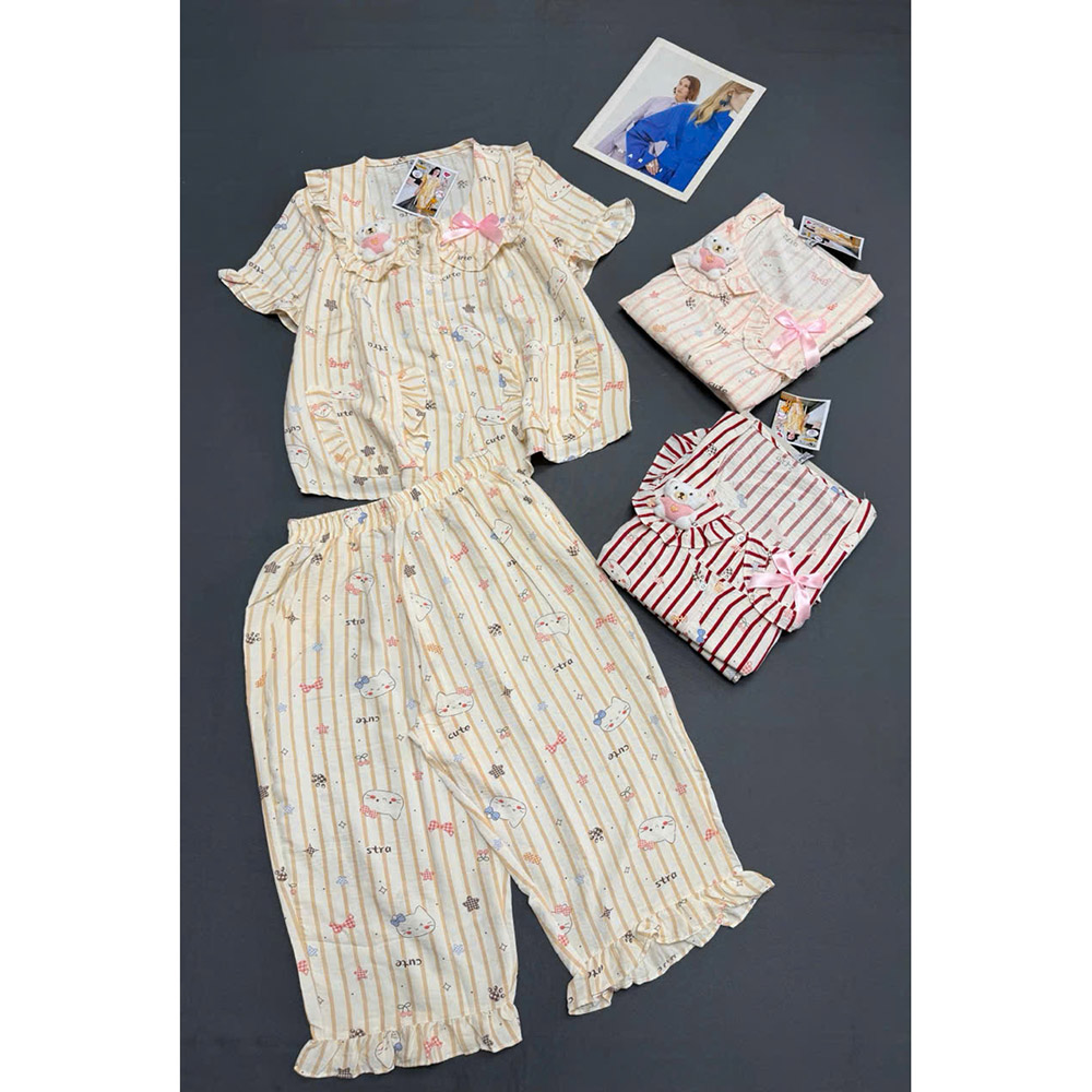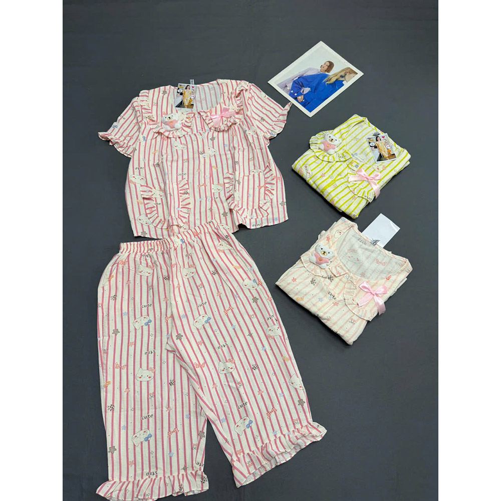 Shop sỉ đồ Bộ Nữ Áo Cổ Sen Tay Ngắn Quần Lửng Họa Tiết Gấu Đáng Yêu Vải Cotton Hàn Mịn Mát Size 45-62kg