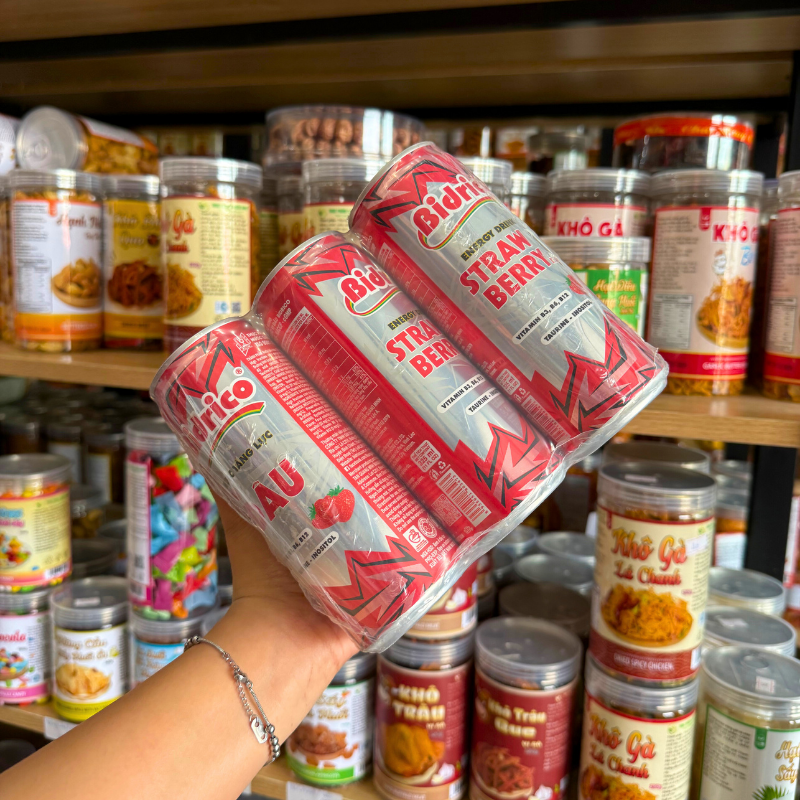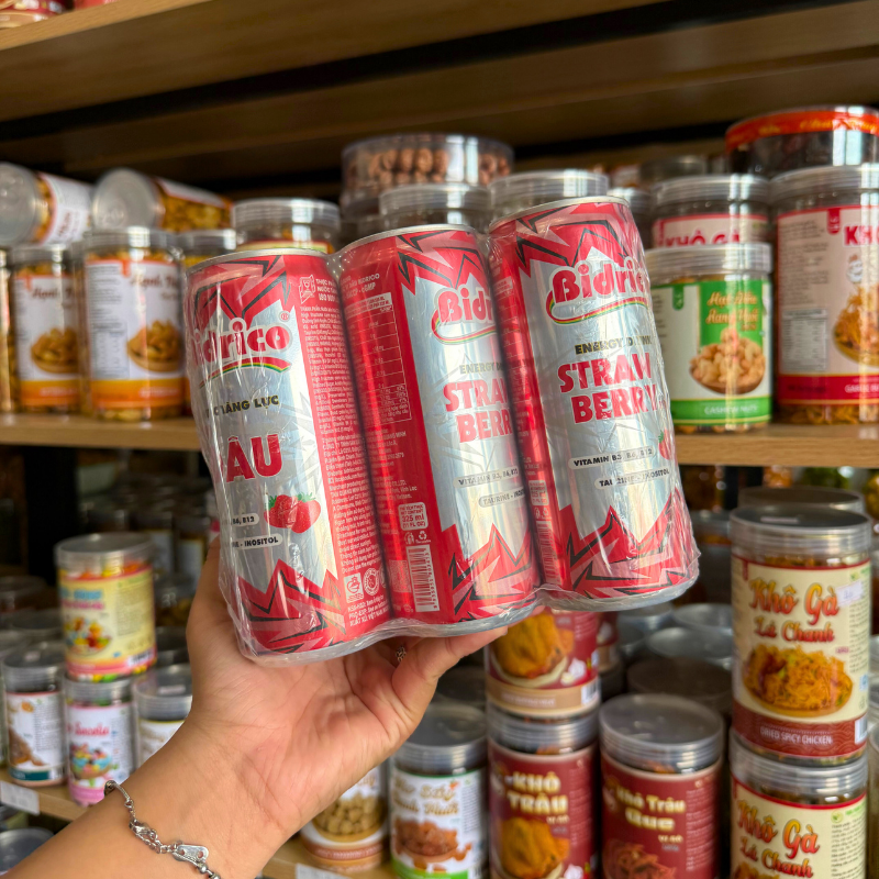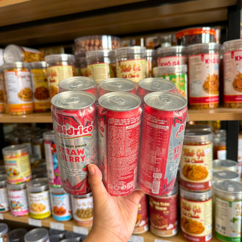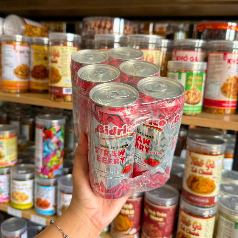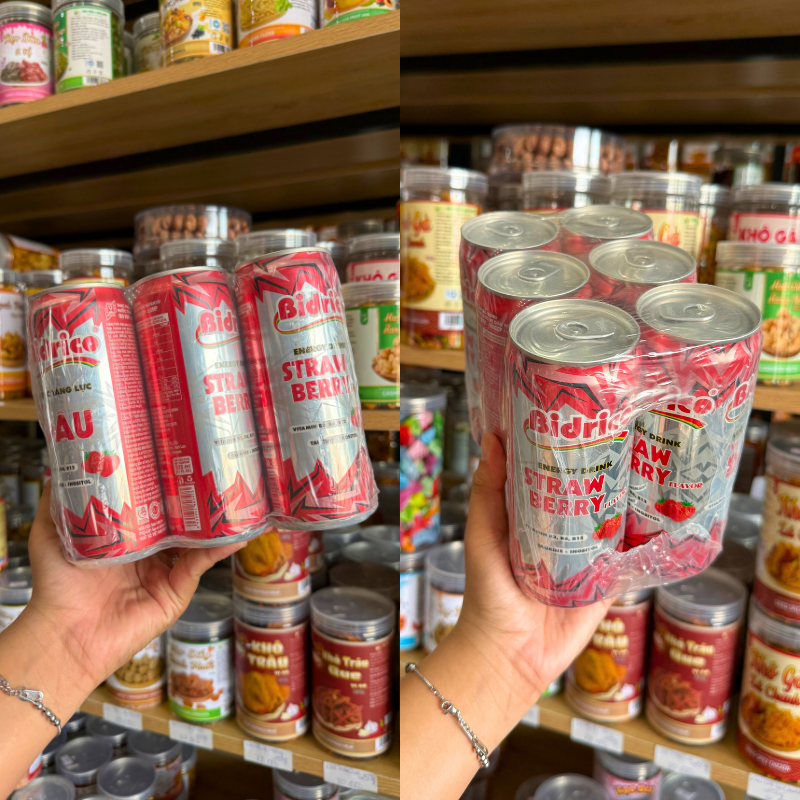 Shop sỉ set 6 Lon Nước Tăng Lực Bidrico Vị Dâu – Nước Ngọt Bidrico Dâu (325ml/Lon)