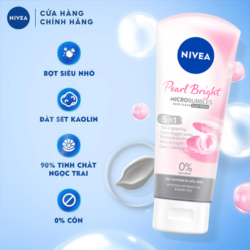 NIVEA PEARL BRIGHT MICROBUBBLES CLAY FOAM là dòng sữa rửa mặt được Nivea nghiên cứu dành riêng cho da thường đến da dầu. Sản phẩm kết hợp công nghệ bọt siêu nhỏ Microbubbles cùng đất sét Kaolin giúp làm sạch sâu bụi bẩn và dầu thừa trong lỗ chân lông. Đồng thời bổ sung tinh chất ngọc trai giúp làn da sau khi rửa trở nên tươi sáng và mềm mịn hơn. Công thức 0% cồn giúp da được làm sạch nhưng vẫn giữ cảm giác dễ chịu, không gây khô căng.